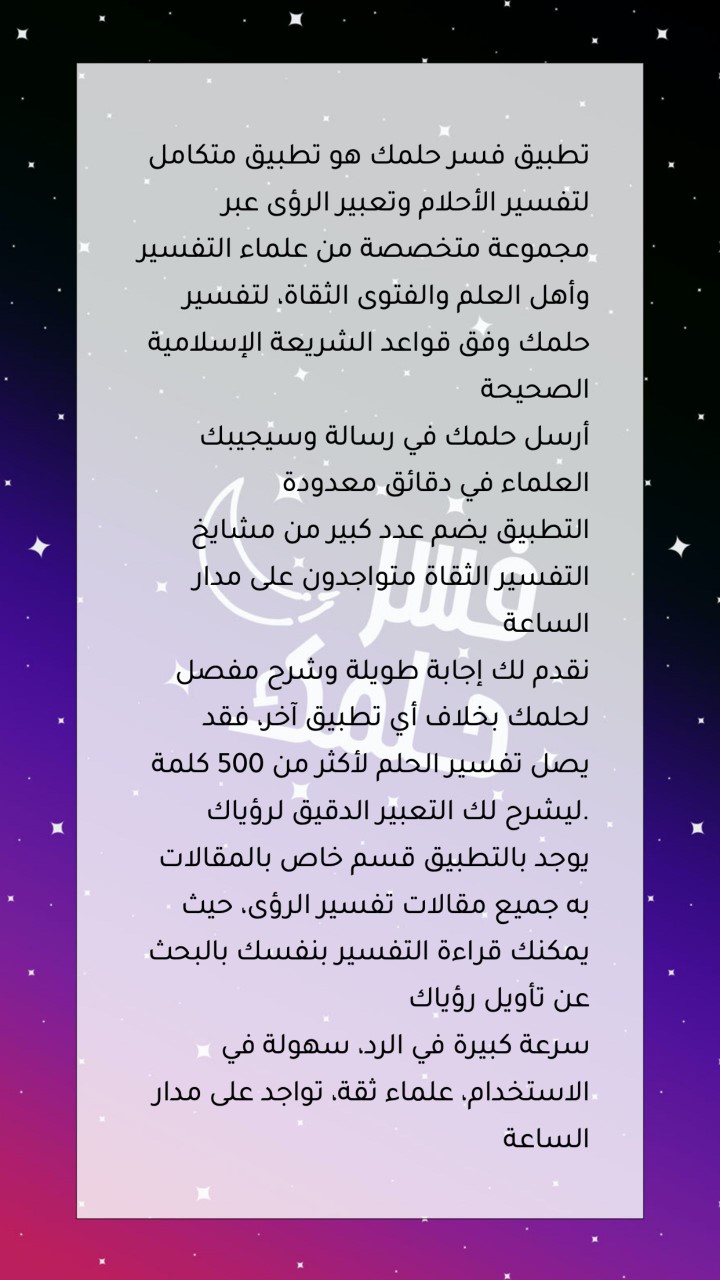 لا يوجد أكثر من المدعين والمستغلين للأشخاص الذين يبحثون عن من يجيب استفساراتهم ويرشدهم إلى ما تؤول إليه أحلامهم ولكن فقط في تطبيق "فسر حلمك" لن تضطر إلى اللجوء إلى شخصًا لا تثق به أو لا يفقه من علم التفسير شيئًا لأنك ستتواصل مع أكبر العلماء والمشايخ المتخصصين.