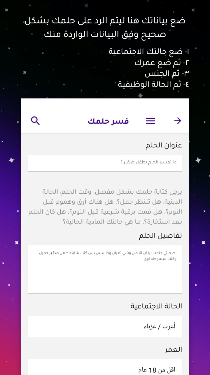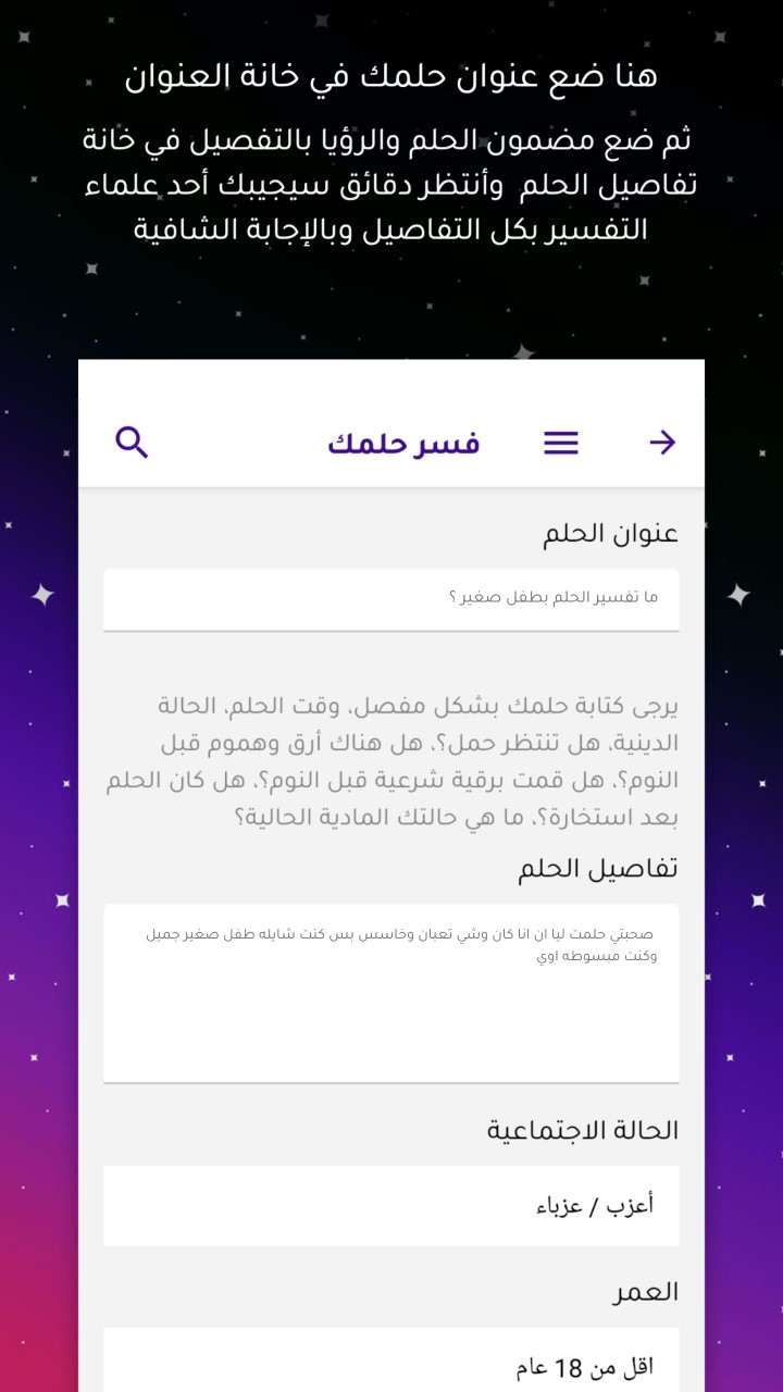في تطبيق "فسر حلمك" ستحصل على تفسير لحلمك في أي وقت سواء في الصباح أو المساء فقط حمل التطبيق ليكون بين يديك لتستيقظ من نومك وتروي لنا تفاصيل حلمك قبل أن تذهب من بالك، وتحصل على تفسيرك فورًا على لسان كبار العلماء في الوطن العربي.