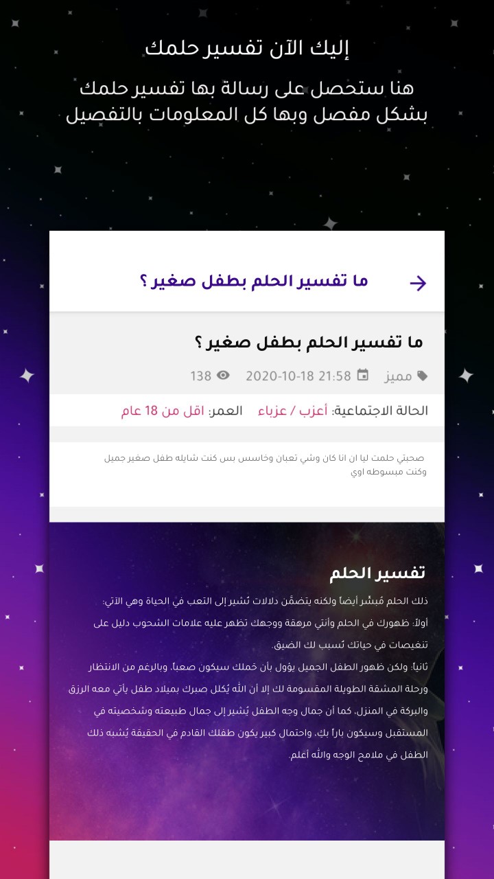كما أن التطبيق يحتوي على العديد من المزايا الأخرى فهو غير معقد مثل أقرانه من التطبيقات بل يتميز بالبساطة والمرونة ويوجد به خاصية خاصة للنقاش مع العلماء حول تفاصيل الحلم أو الرؤية، فبادر بتحميله الأن.